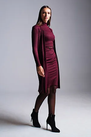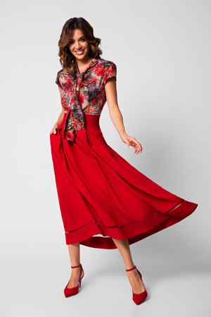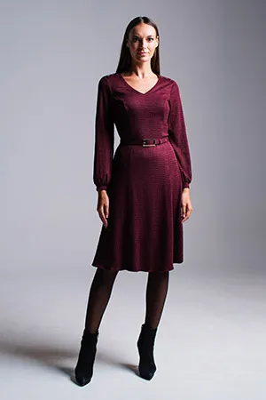 Feminine red midi dress with long sleeves, perfect for special occasions.