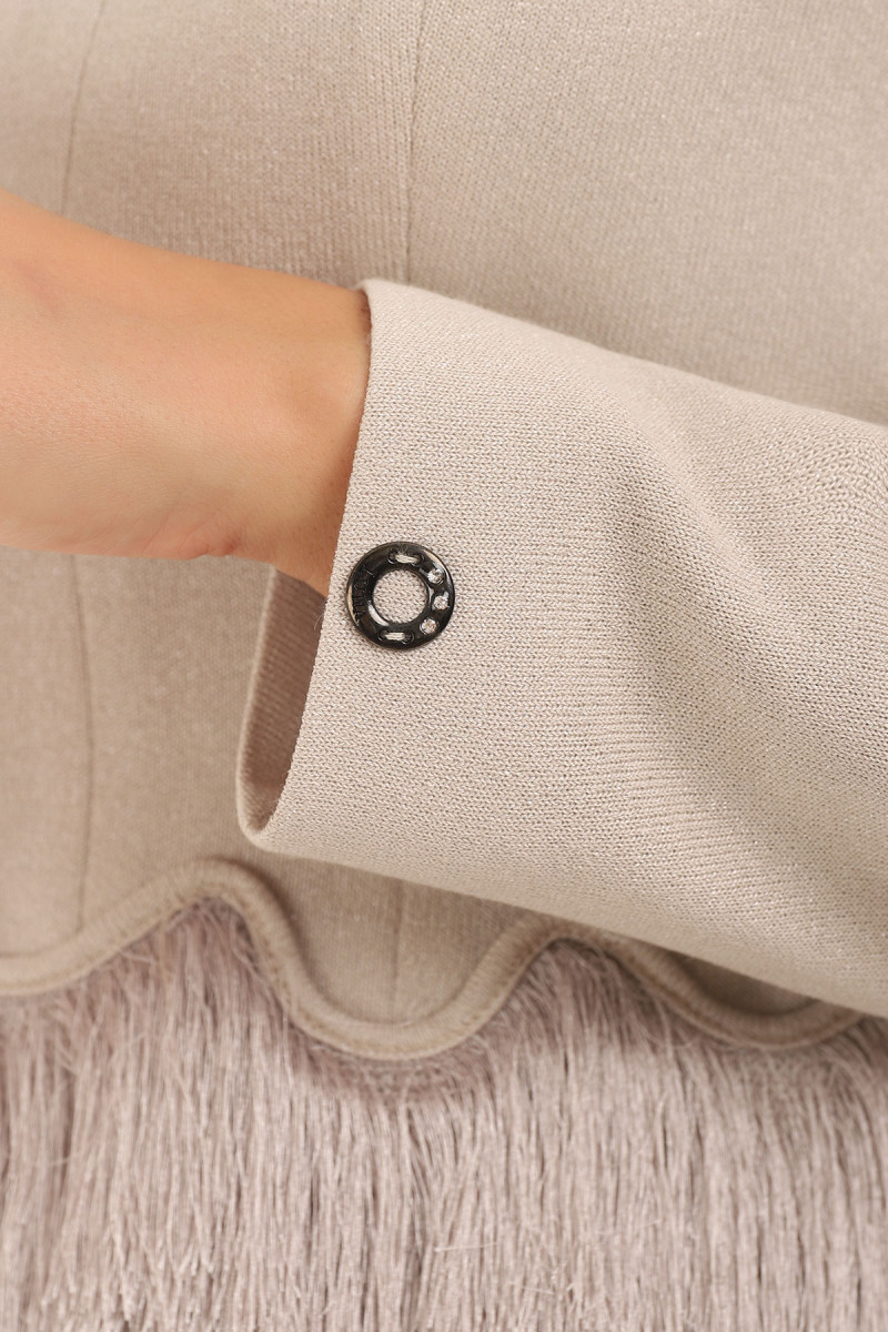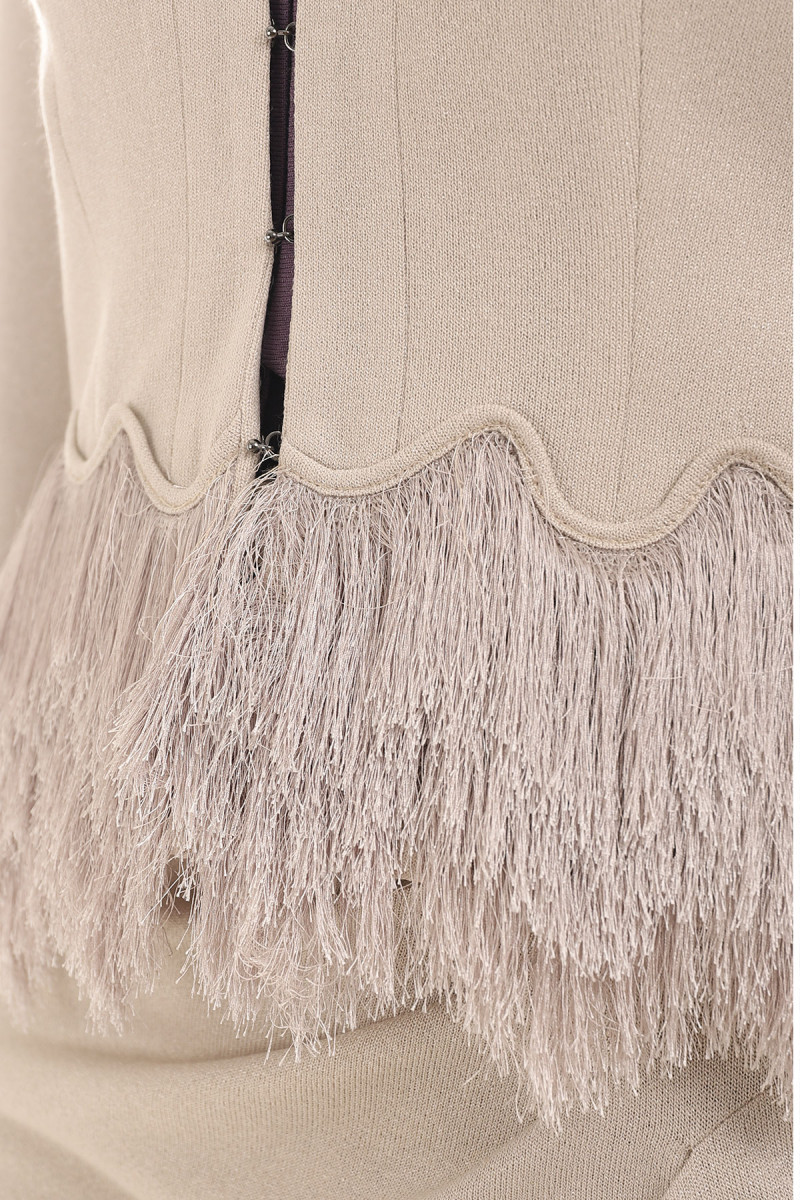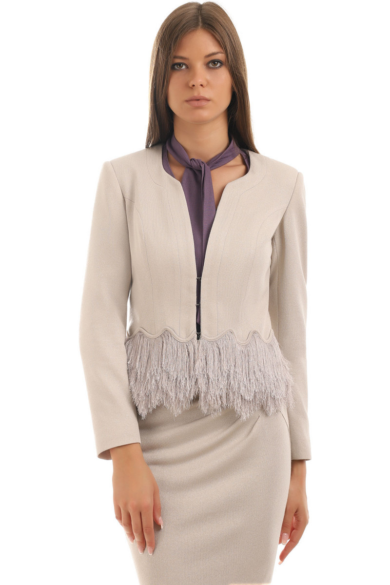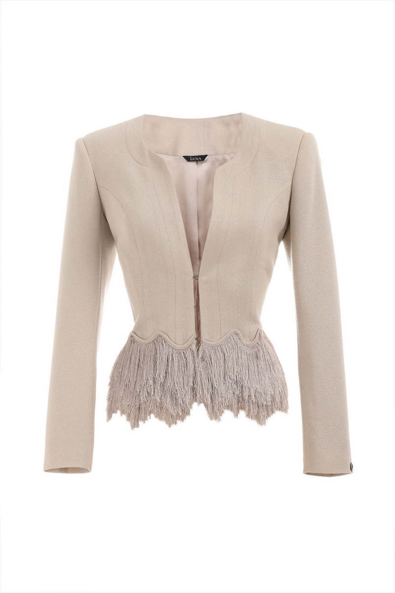 Waisted short beige blazer for special moments. Specific fringes extend from the waist line downwards, which make it very impressive and extravagant. By combining it with a skirt from the same line, you will get a perfect outfit.