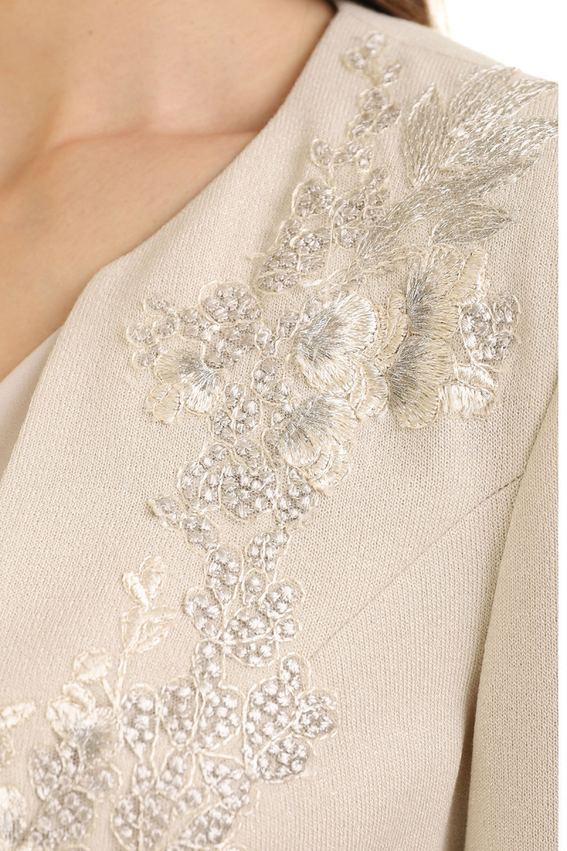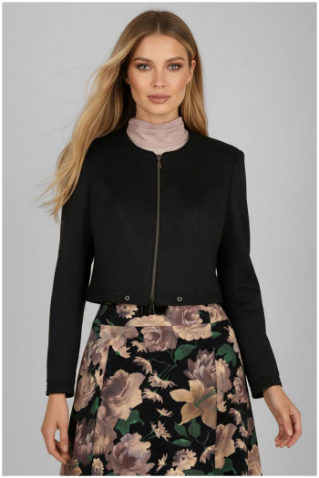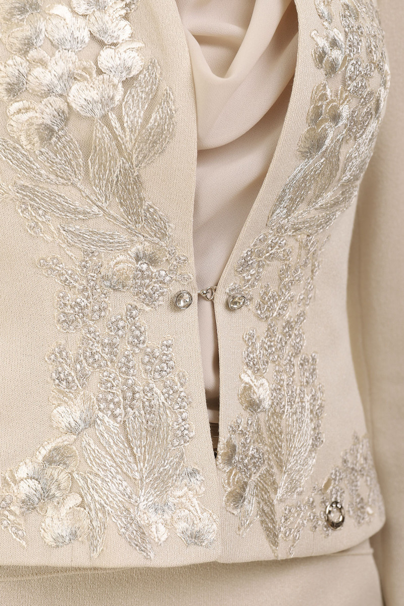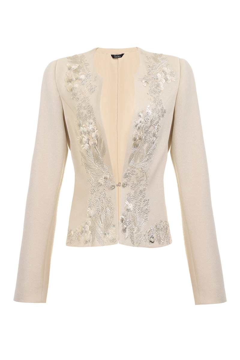 A short, tailored blazer in a soft beige shade that adds refined sophistication to any out...