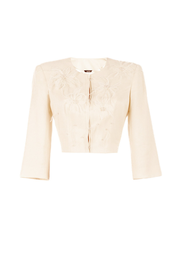 A short-cut blazer with 3/4 sleeves. Floral appliqués and pearl details add a special charm and originality to this blazer. The model features a center front closure and a tailored fit. It pairs perfectly with pieces from the same collection.