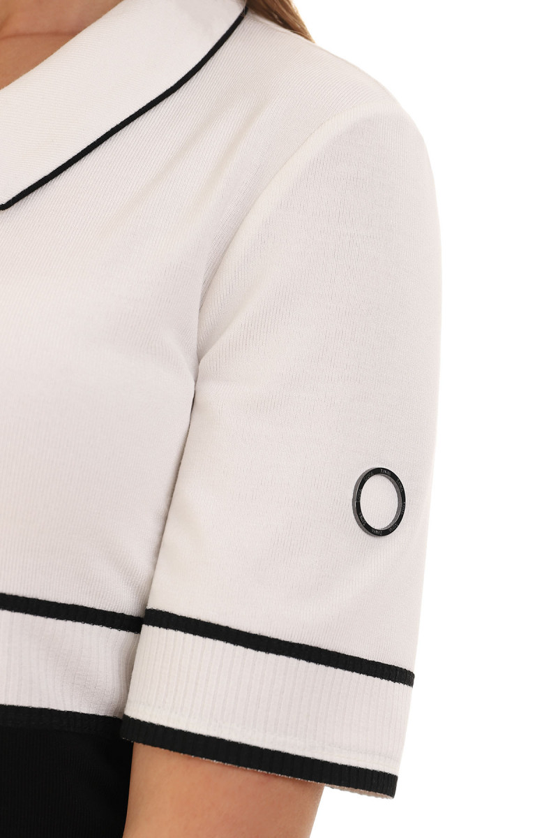 A harmonious top with short sleeves. It is made of natural fabric with elastane. It fits any body shape and matches perfectly with different outfits. It is an excellent item of clothing on summer days, but with a combination of a blazer jacket or a jacket, it can be your choice on other occasions as well.