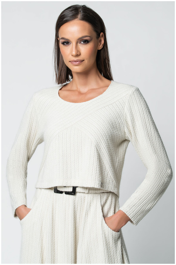 The blouse with a shorter cut made of viscose knit pairs well with a skirt in a complementary pattern.