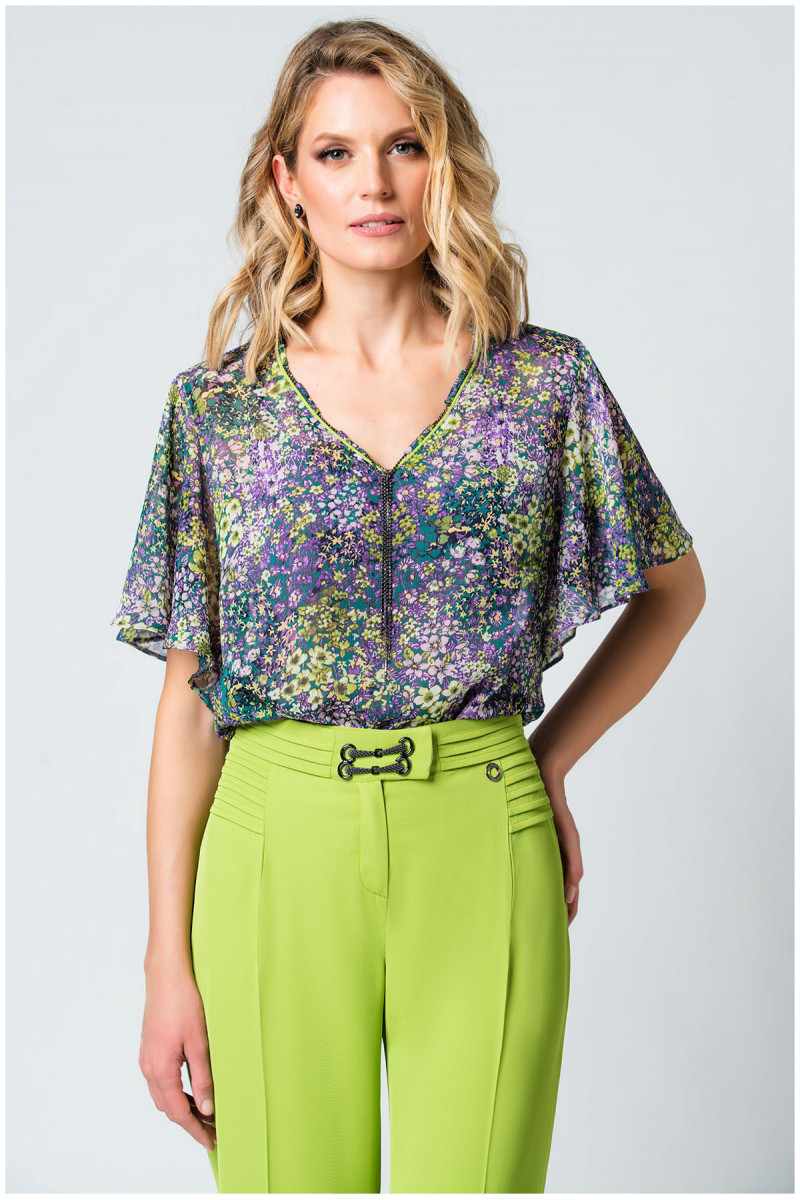 A solid color blouse with short, flowy sleeves is suitable for both casual and elegant out...