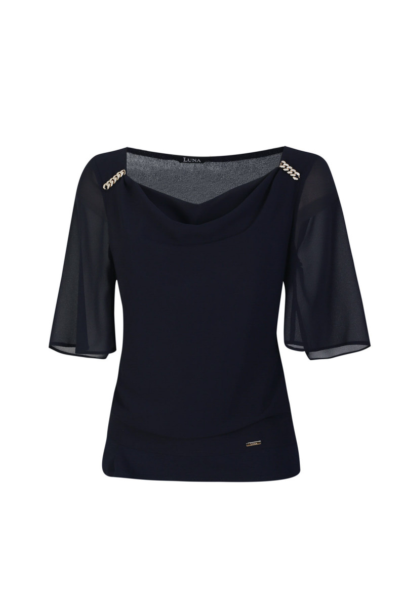 A solid-color blouse with 3/4 sleeves. It is embellished with decorative jewelry around the neckline. The viscose lining with a high percentage of elastane ensures great comfort during wear.