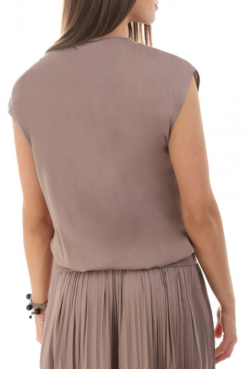 An elegant T-shirt with pleats on the chest and a specific application on the shoulders is...
