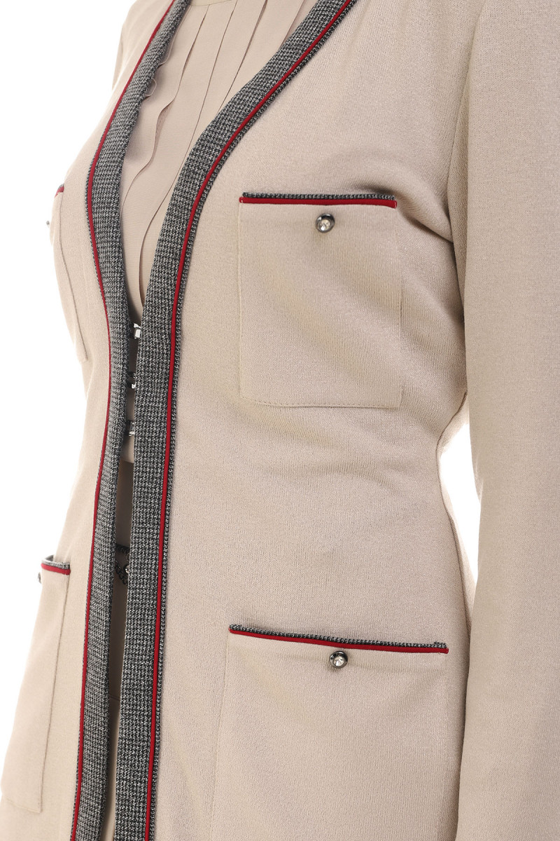 Beige cardigan with metallized fibres and a high percentage of elastane in the fabric