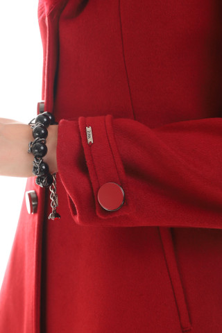 Elegant red coat for cold days made of fabric with a high percentage of wool.