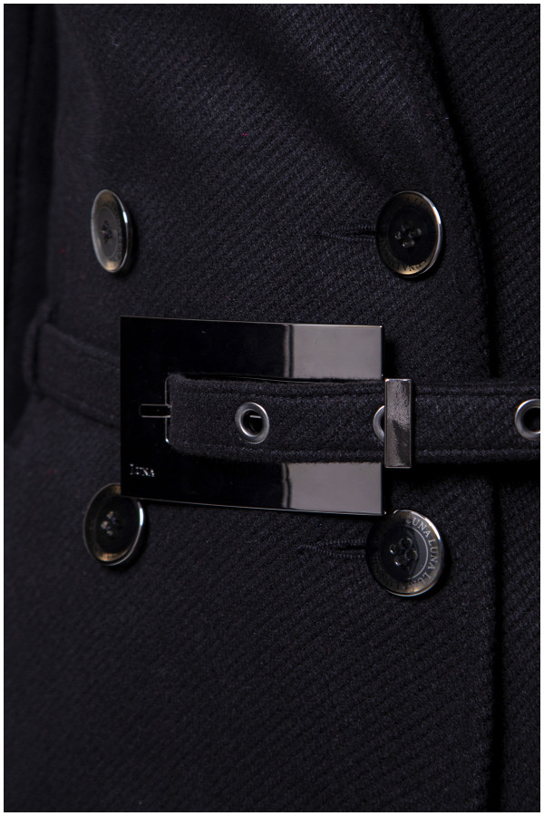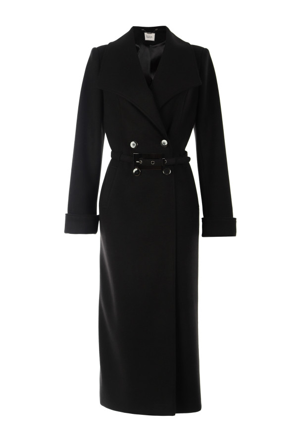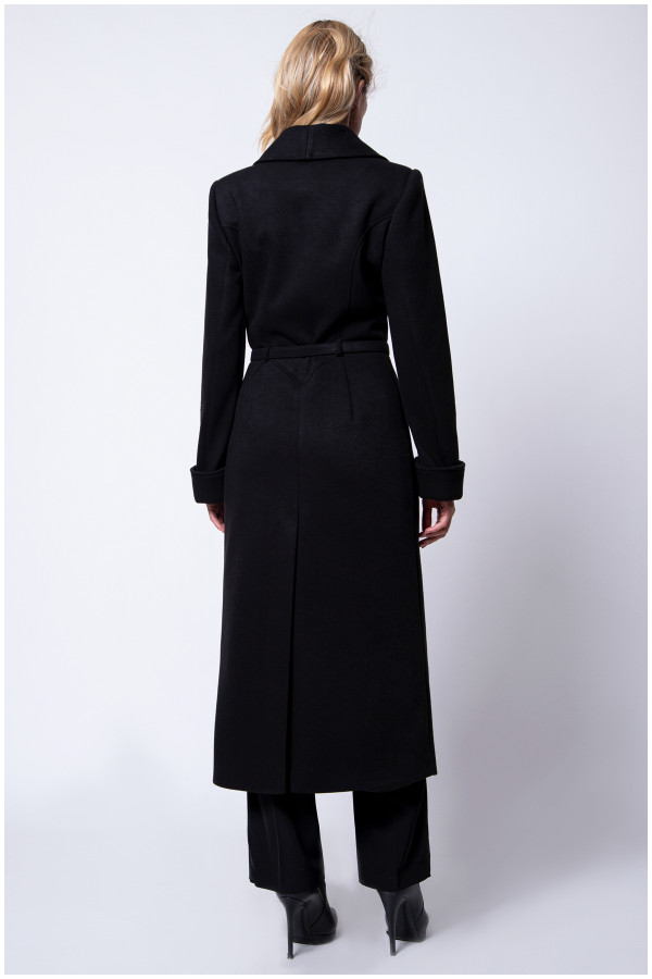 An elegant long coat in black with a wide collar and belt. The tailored cut follows the body’s line while providing ample room for a comfortable fit. The model features a double-breasted crossover closure.