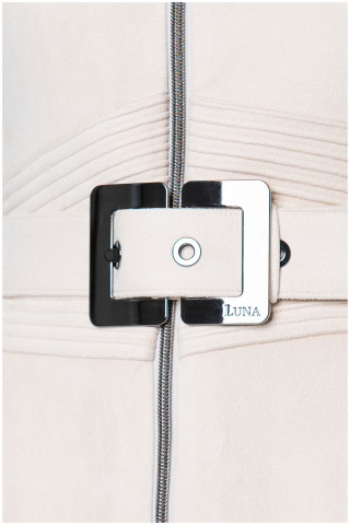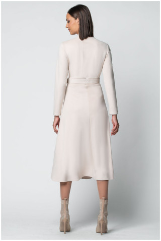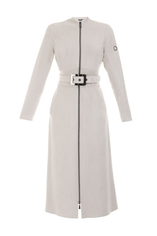The beige A-line dress fits perfectly with all body types. The gentle material with elastane makes it very comfortable to wear. With the help of the two-way zipper, you can adjust the depth of the neckline and slit.