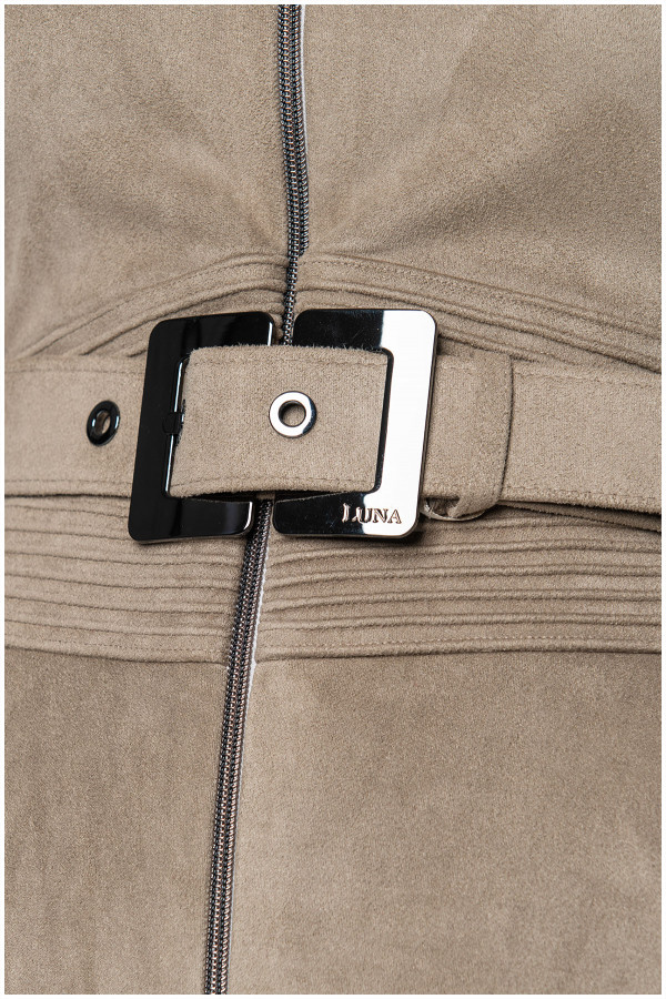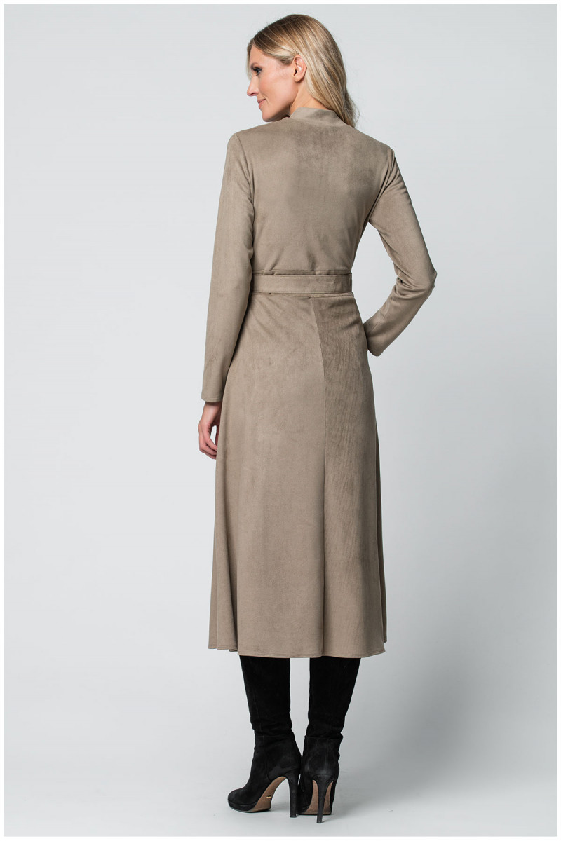 The sand shaded A-line dress fits perfectly with all body types. The gentle material with elastane makes it very comfortable to wear. With the help of the two-way zipper, you can adjust the depth of the neckline and slit.
