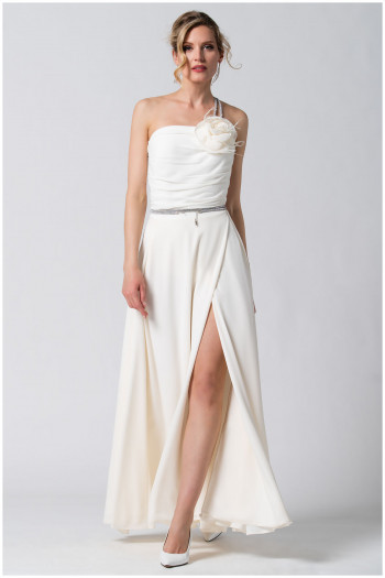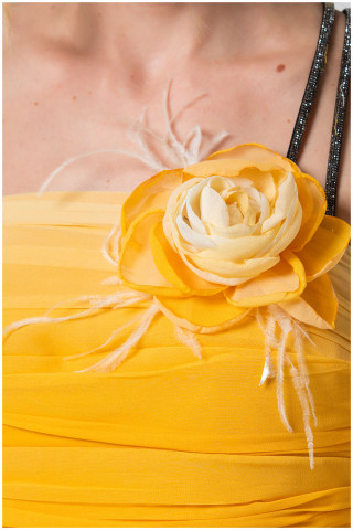 Long ombre yellow dress. Enhanced with pleats around the bust area in the form of a corset. A zipper located on the side makes dressing easier. If you want to achieve a more understated look, you can remove the belt in the form of jewelry, the straps, and the flower brooch.