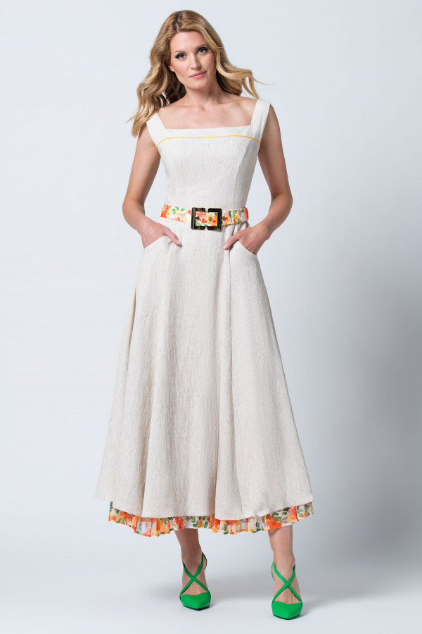 The A-line maxi dress in beige is perfect for pairing with shoes and jewelry from the Luna...