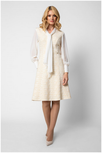 An elegant beige wide-cut dress is ideal for business dinners or other formal events.