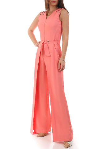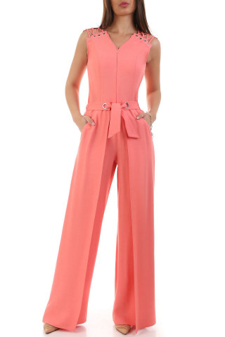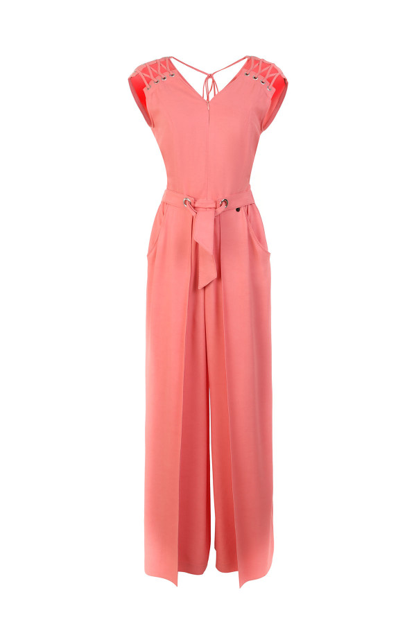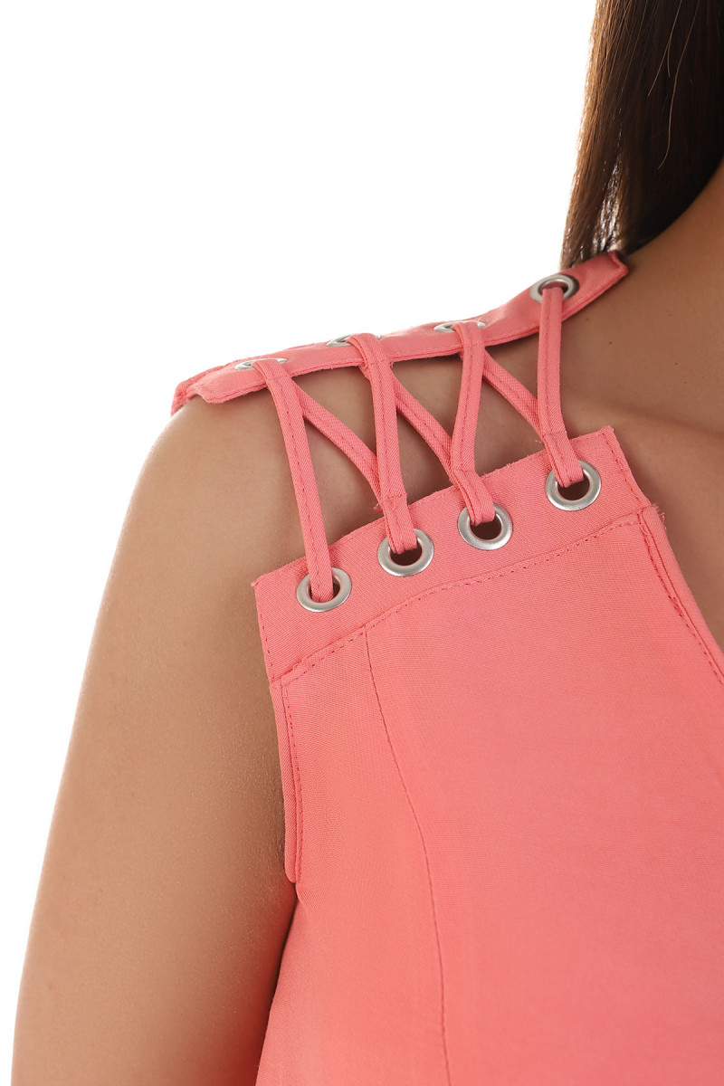 Elegant sleeveless overallwith decorative laces on the shoulders.