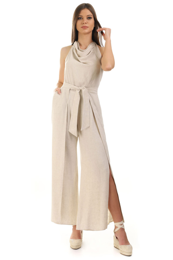 Beige jumpsuit made of natural materials. Its loose fit with pleats makes it suitable for all body types. The belt and tie-neck detail allow you to adjust this model to your proportions. Pair it with your favorite shoes and handbag, and you're ready to go out.