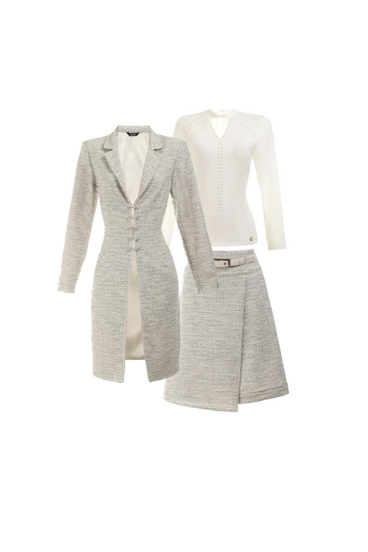 A beige-gold coatl woven with lamé fibers goes perfectly with pants and skirt from the ...