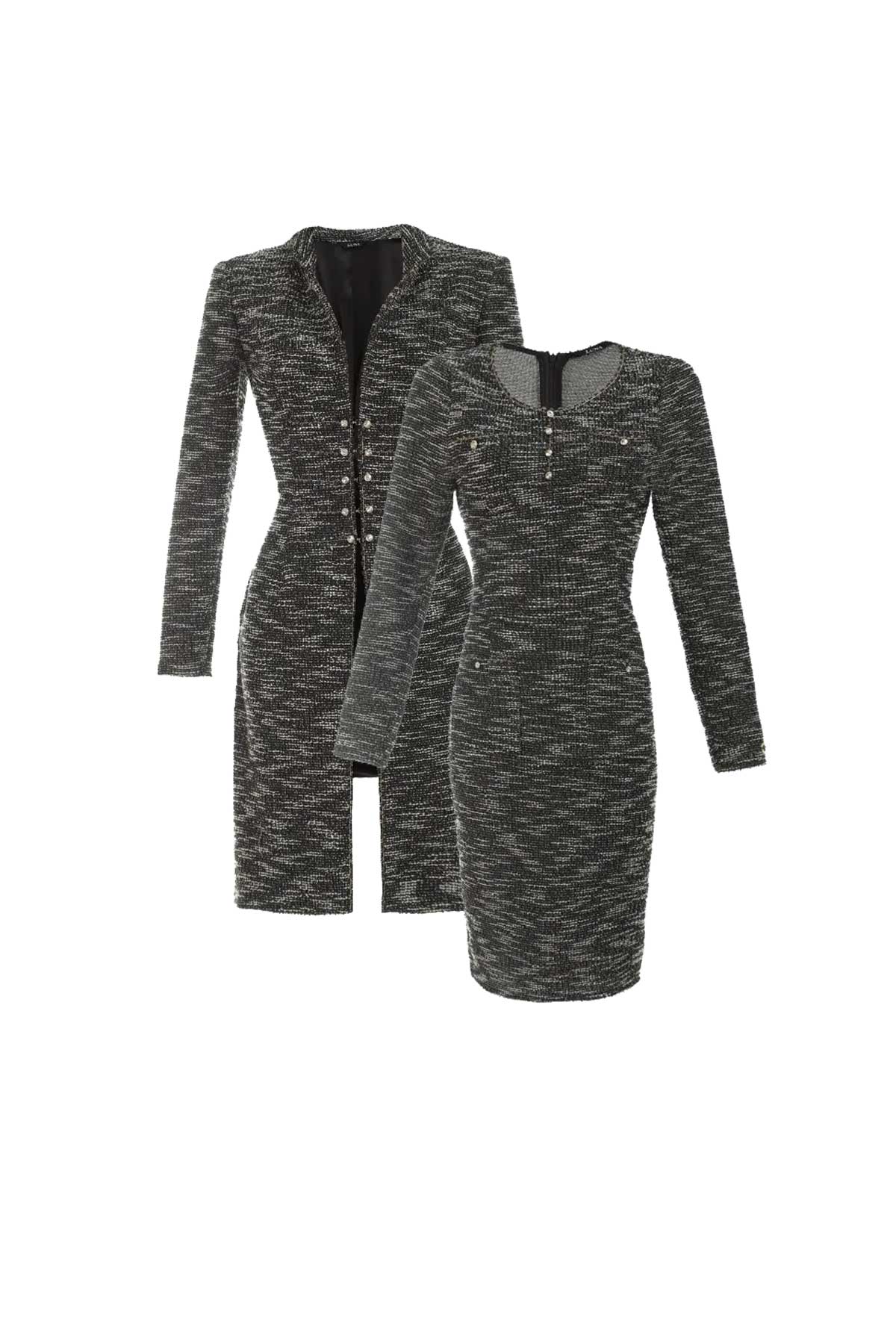A black-white coatl woven with lamé fibers goes perfectly with pants and skirt from the...