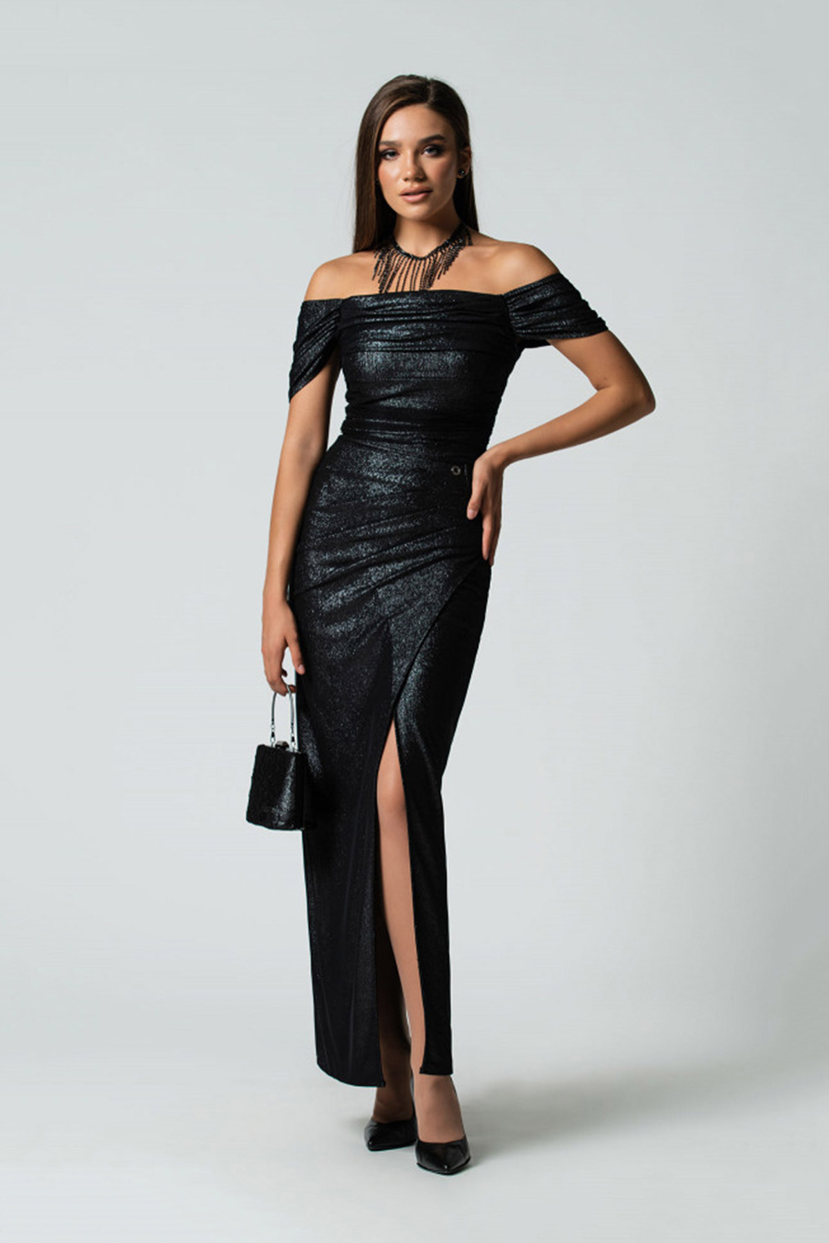 Glamorous anthracite necklace with tassels is a great way to make your outfit stand out.