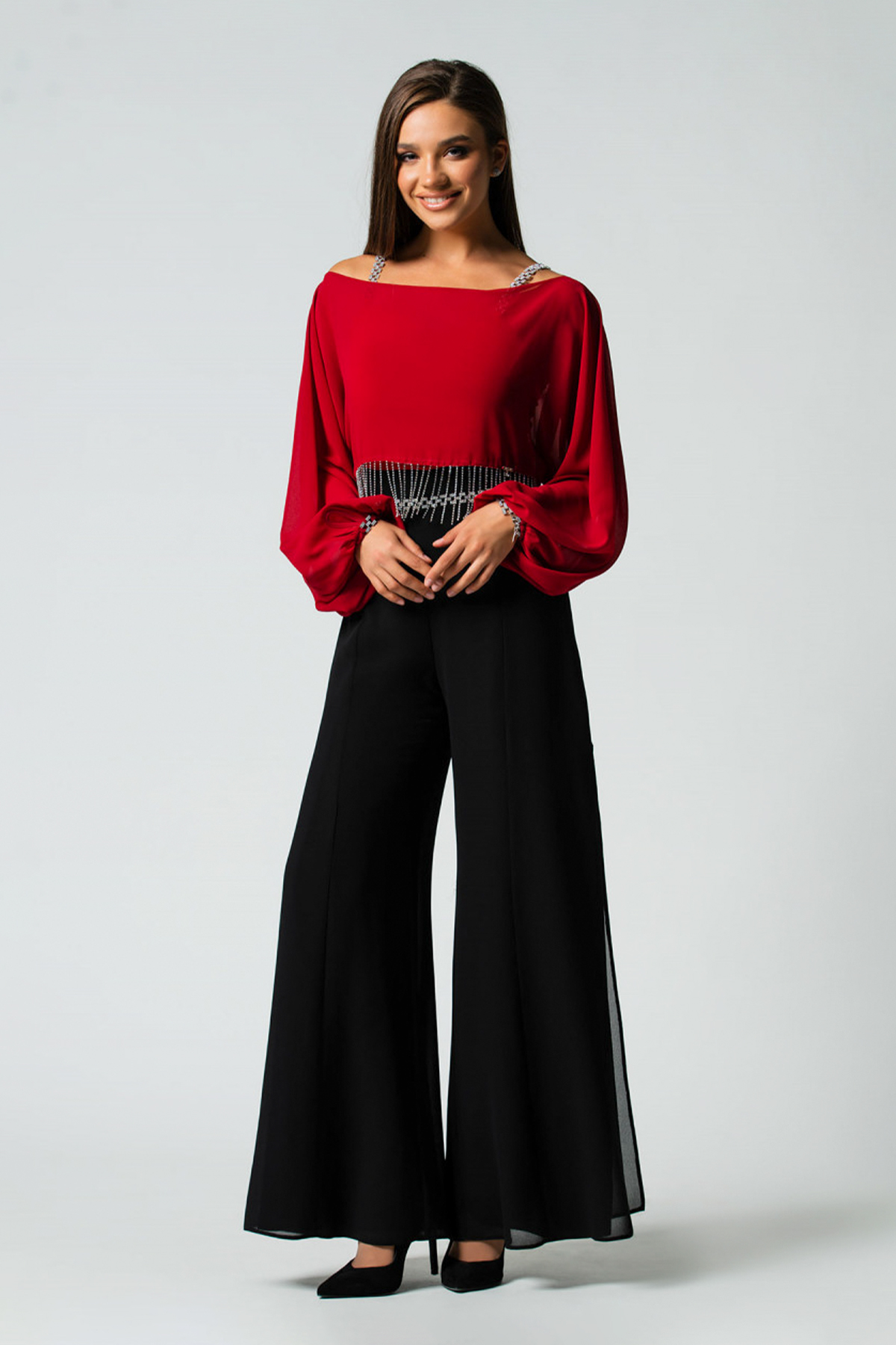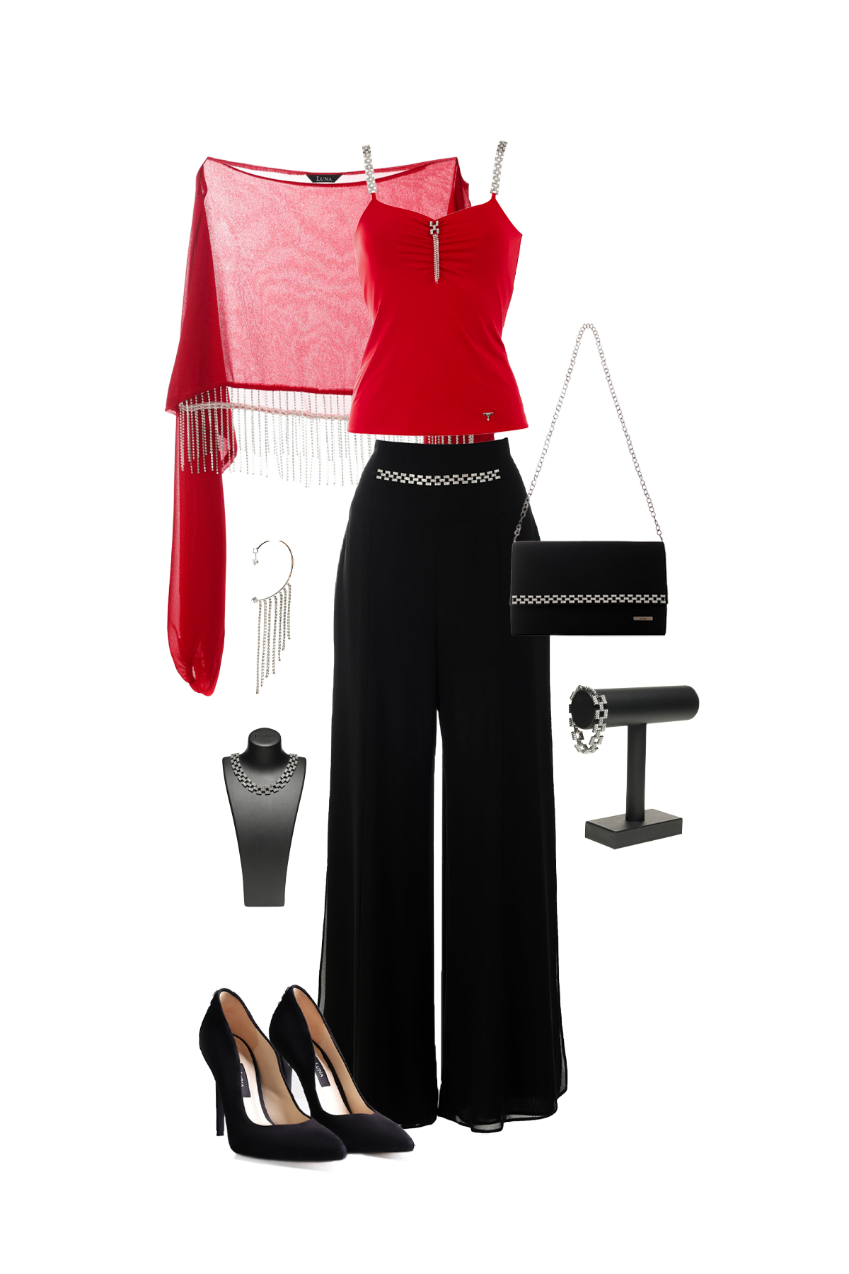 Red top with elegant zircon straps adds a striking and sophisticated look to your outfit.