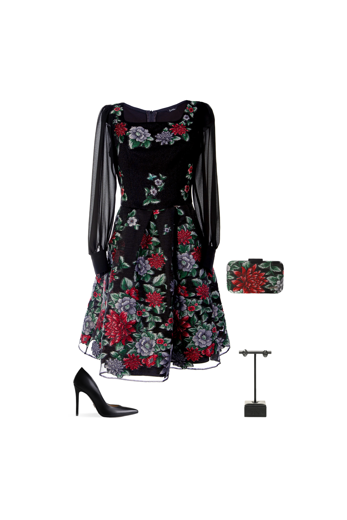 Short floral-patterned dress with a square neckline and sheer sleeves.