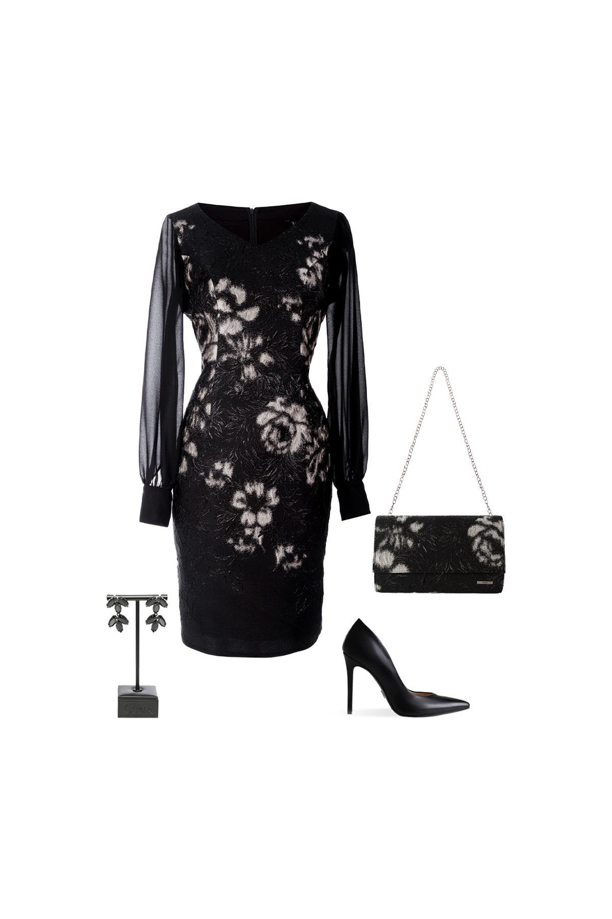 Form-fitting floral dress with a V-neck and long transparent sleeves.