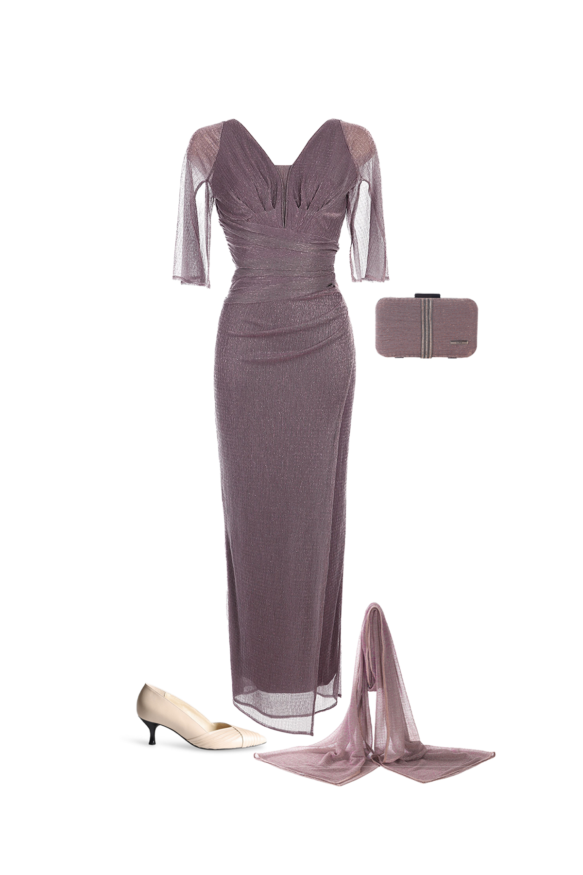 An elegant long dress embellished with pleats around the bust and waist on the front.