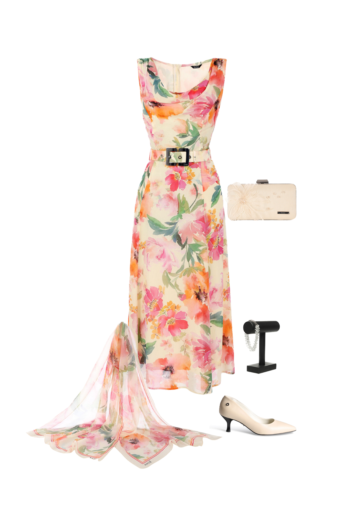 A feminine sleeveless midi dress with a floral pattern.