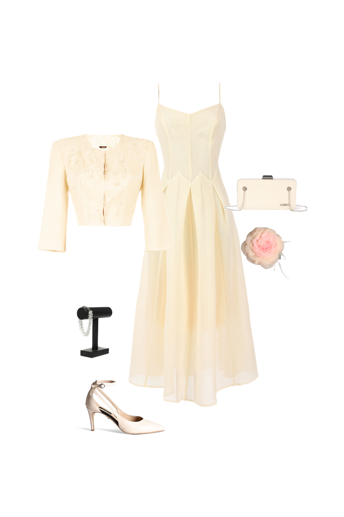 A beige A-line midi dress is perfectly paired with shoes and jewlery from the Luna collec...
