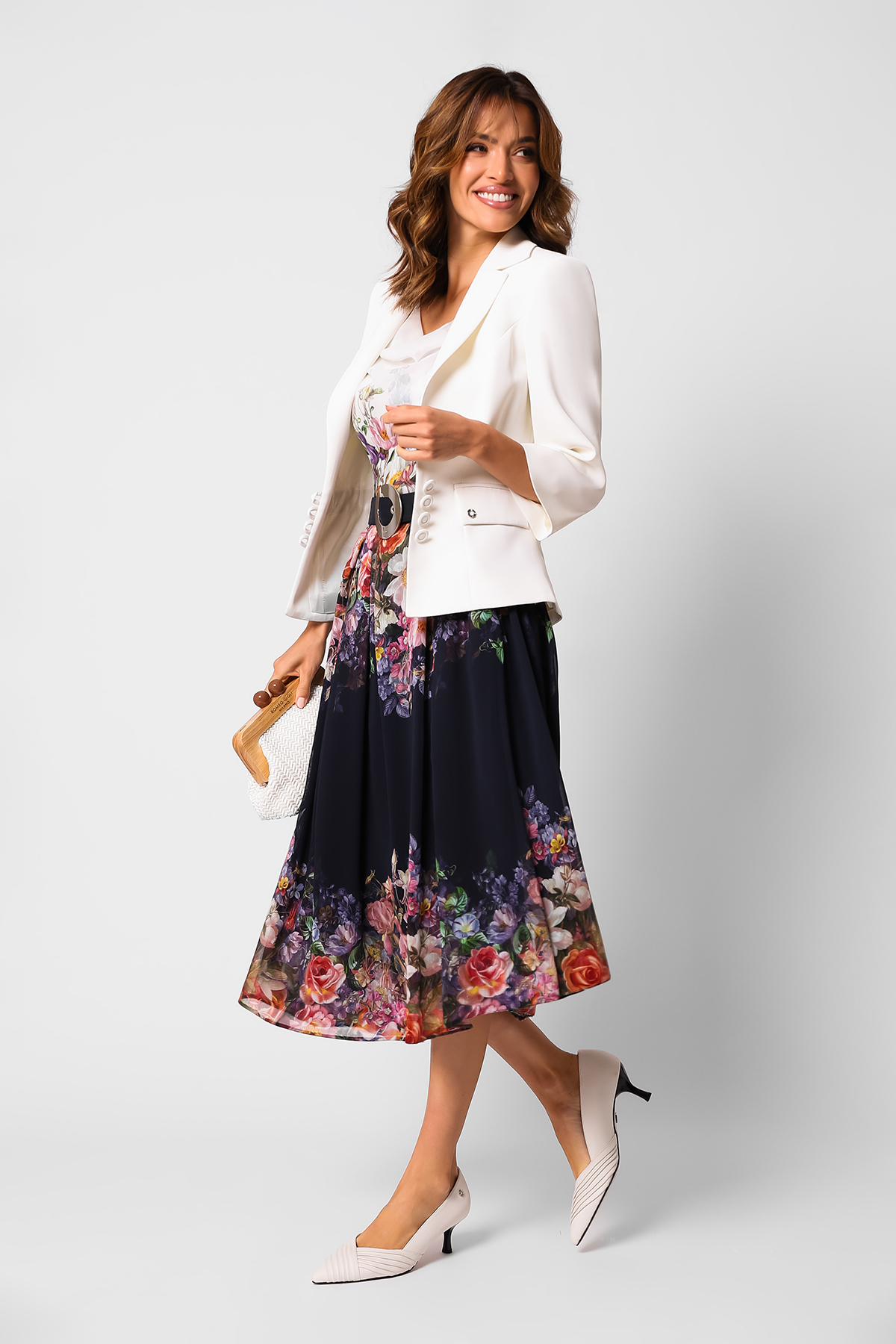 A silk scarf with a floral pattern will complete your outfit and add a striking touch.