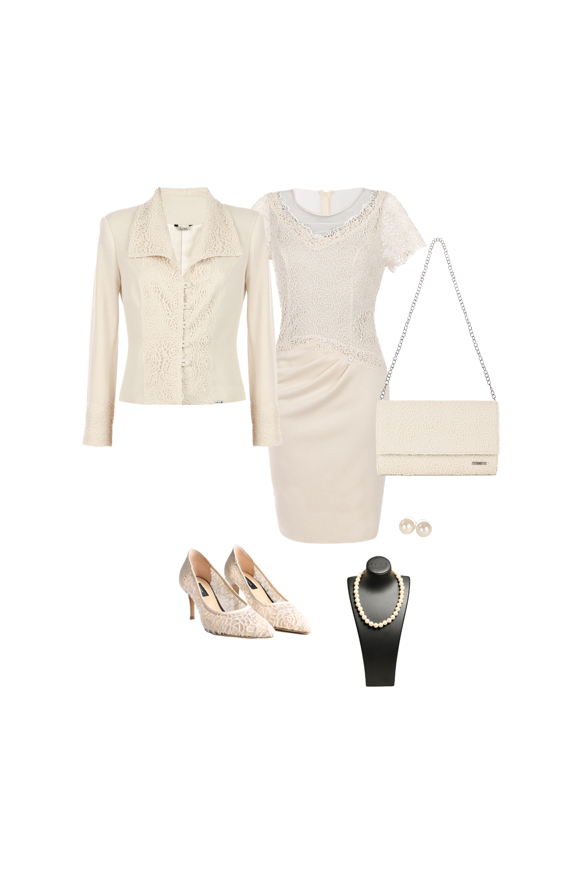 Elegant beige dress adorned with lace details, perfect for special occasions.