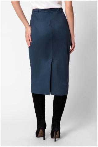 Long straight-cut wrap skirt adorned with decorative buttons along the side. This model features side pockets and an imitation belt. We recommend pairing it with the blazer from the same collection.