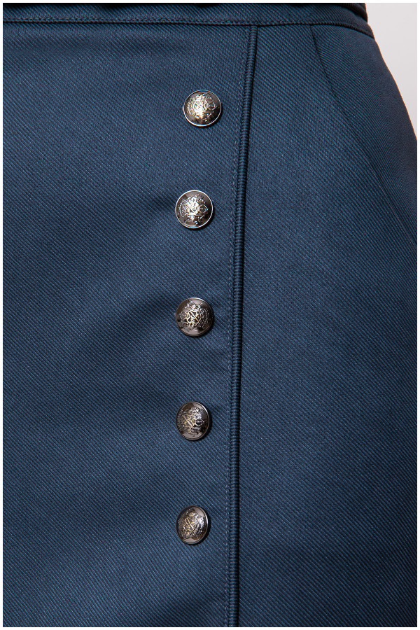 Long straight-cut wrap skirt adorned with decorative buttons along the side.