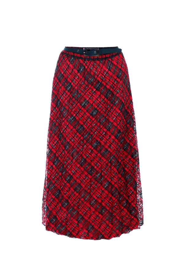 A long pleated skirt with a checkered pattern fits all body types perfectly. The elastic waistband is adorned with a belt imitation. You can pair the skirt with complementary pieces from the accompanying Luna collection.