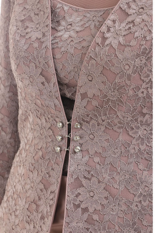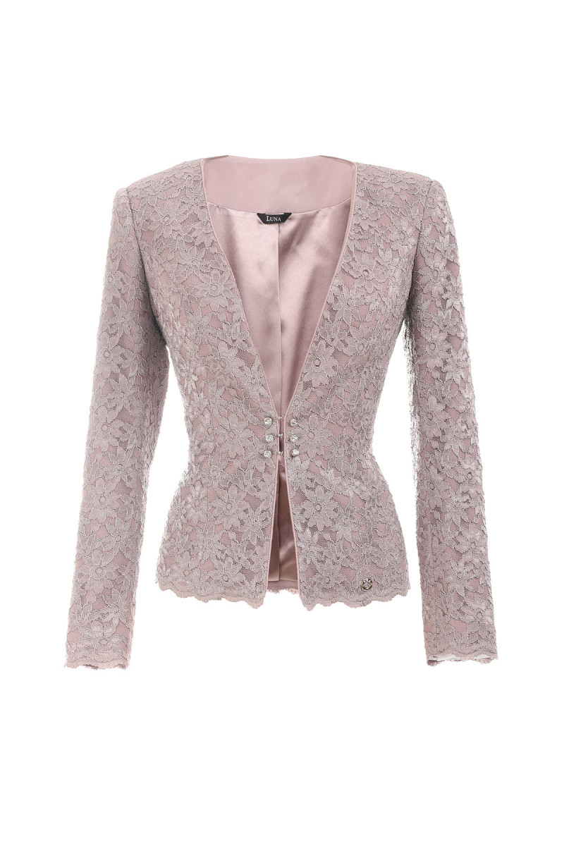 A short, tailored blazer in a soft beige shade that adds refined sophistication to any out...