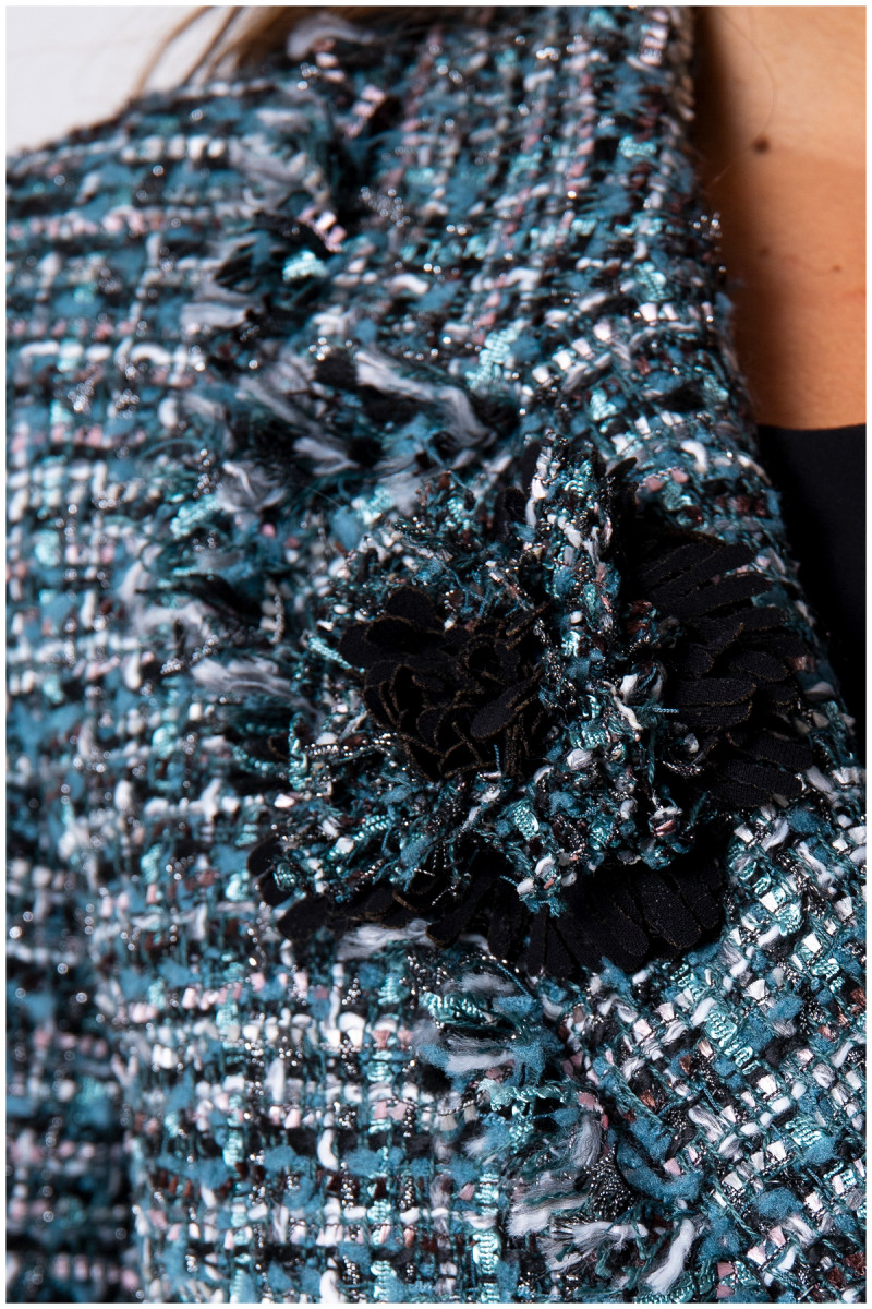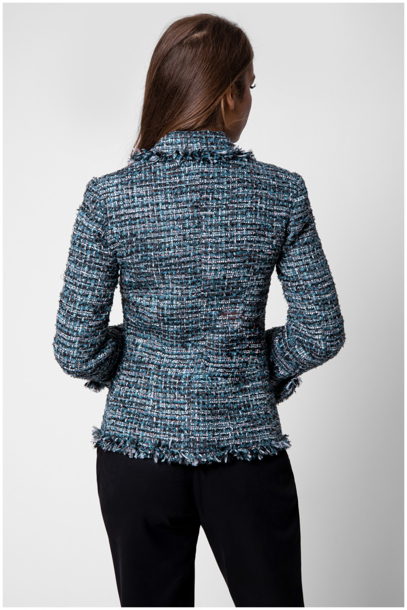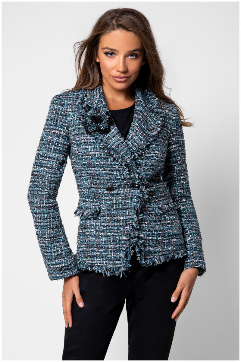 An attractive plaid blazer made from tweed fabric. The central fastening highlights your waist, adding a refined touch. The jacket features flap pockets and a collar with notched lapels. It pairs perfectly with solid-colored pants or skirts from the same collection.