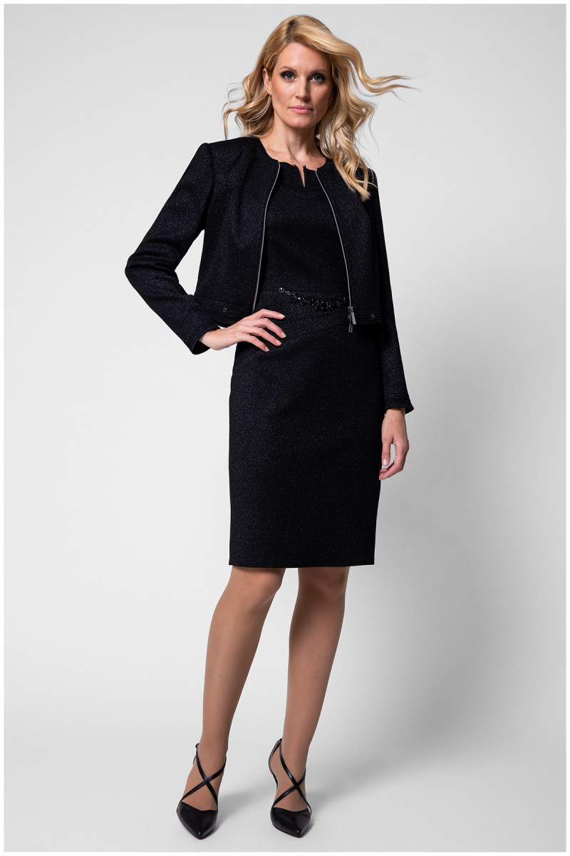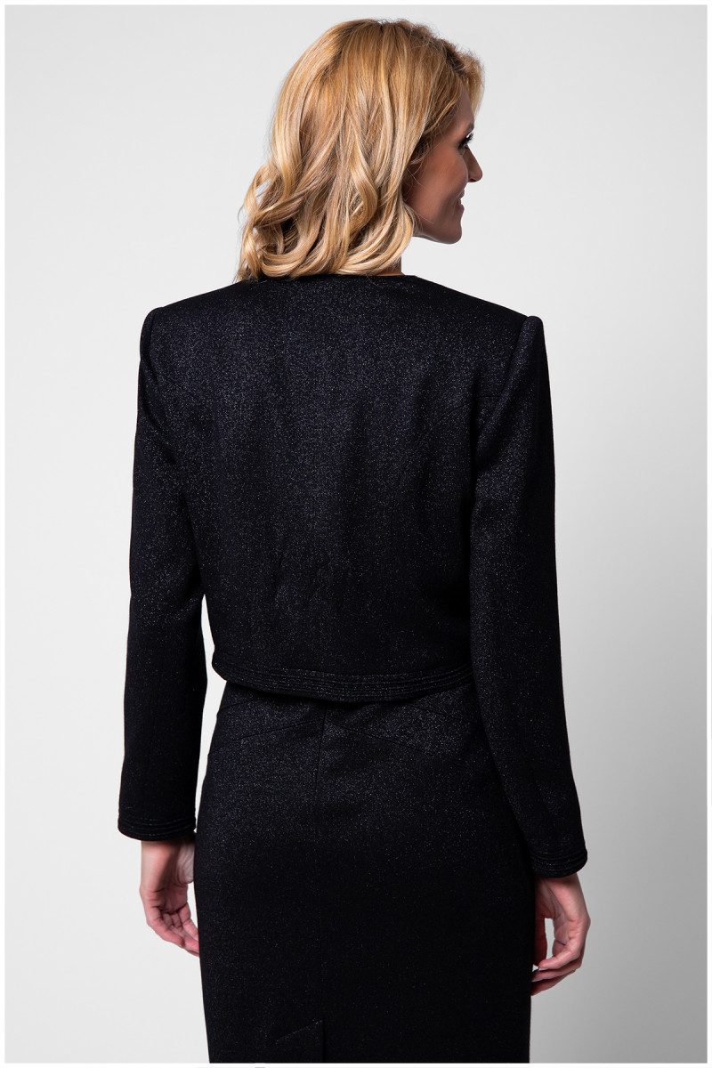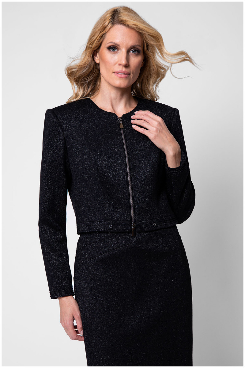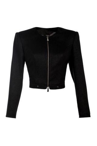 A classic black hip-length blazer with long sleeves and a round neckline. It fastens with a two-way zipper. It pairs perfectly with pieces from the same collection.