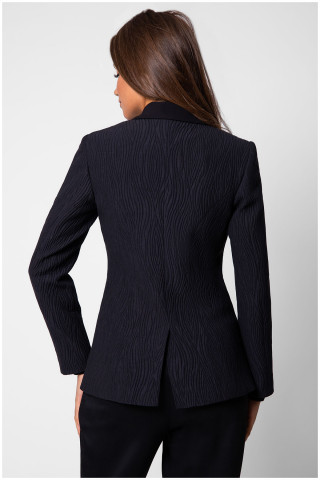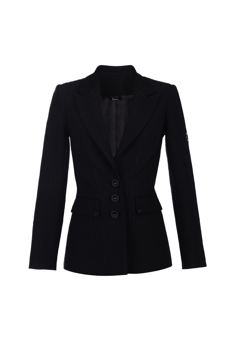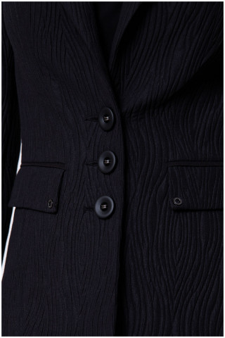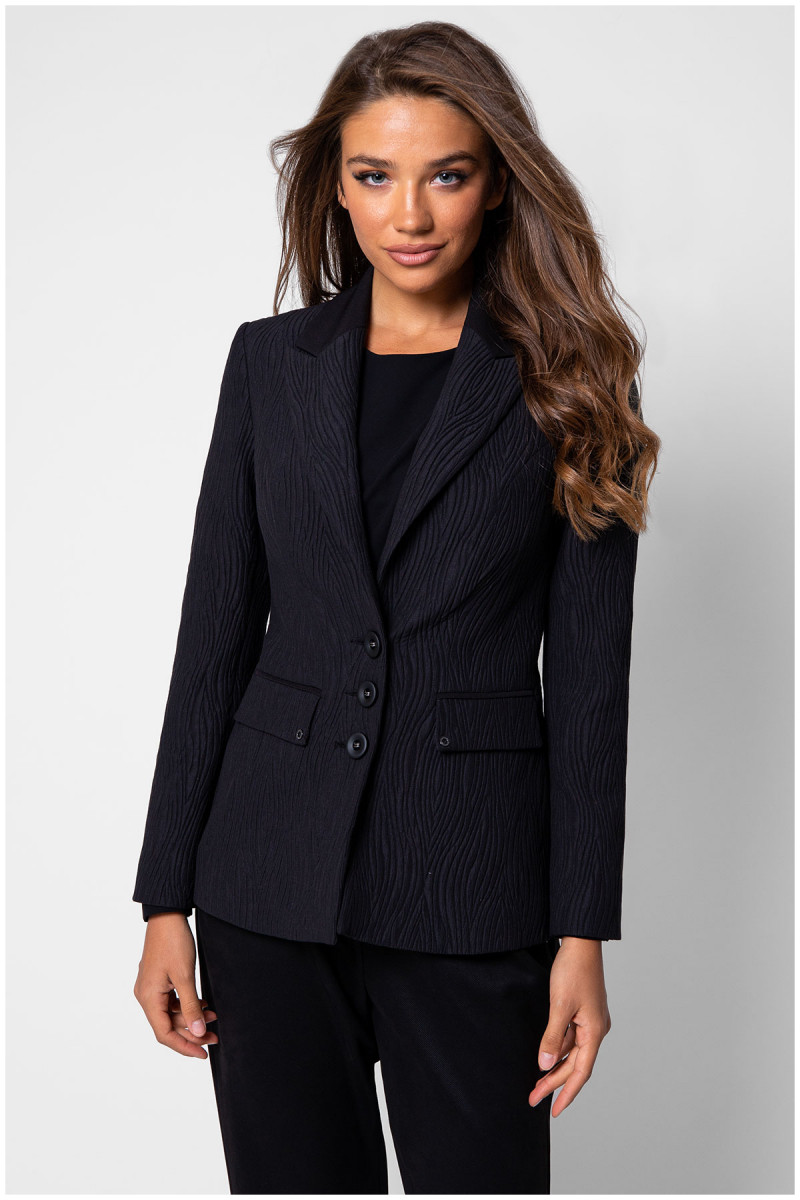 A fitted black blazer with long sleeves. The model features flap pockets and fastens with three buttons in the center. It pairs excellently with other pieces from the same collection.