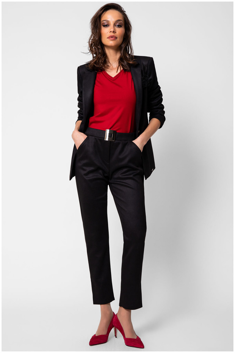 Elegant black slim-fit pants pair perfectly with a complementary blazer.