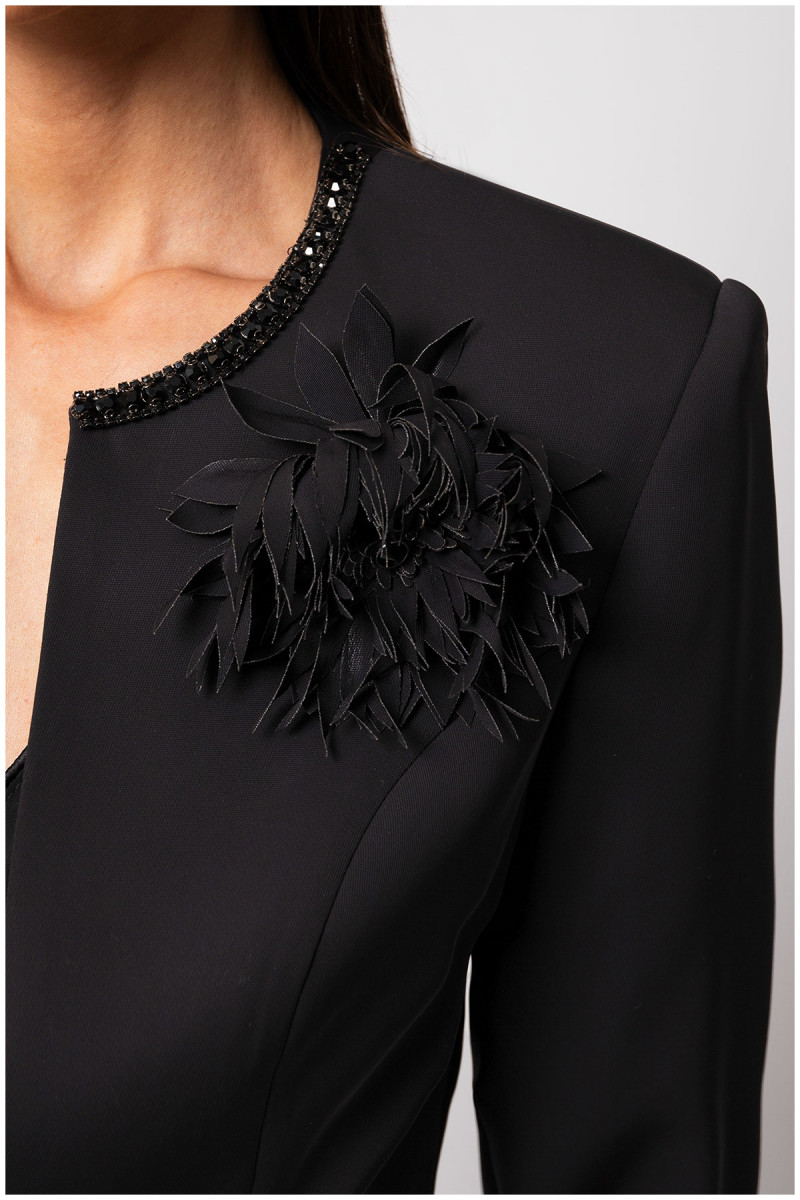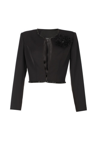An elegant black cropped blazer outlined with silver details, pairs perfectly with pieces from the complementary collection.