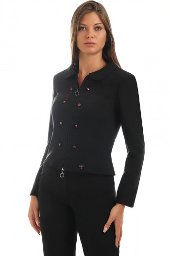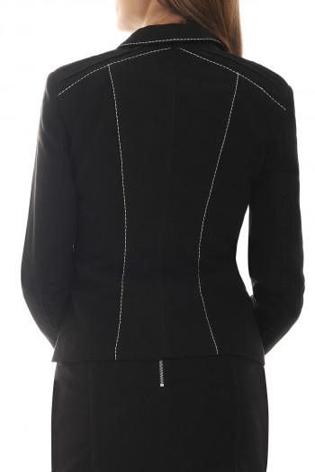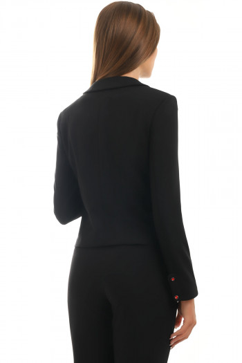 Elegant short blazer of classic cut with specific details on the edges of the sleeves.
