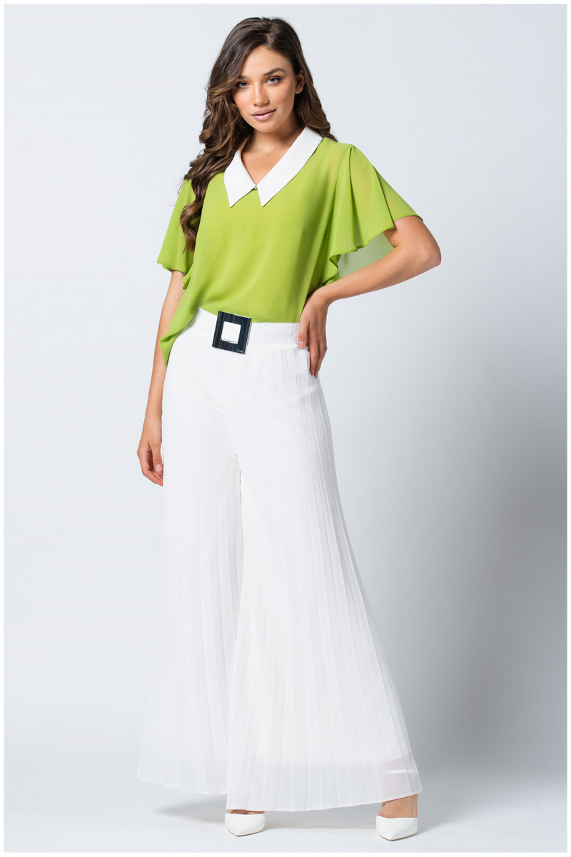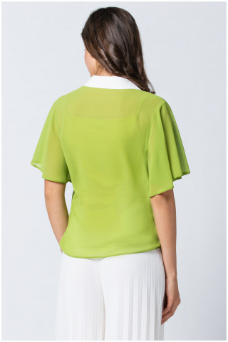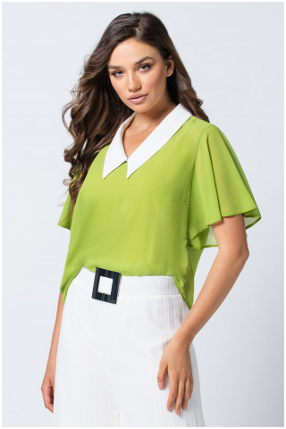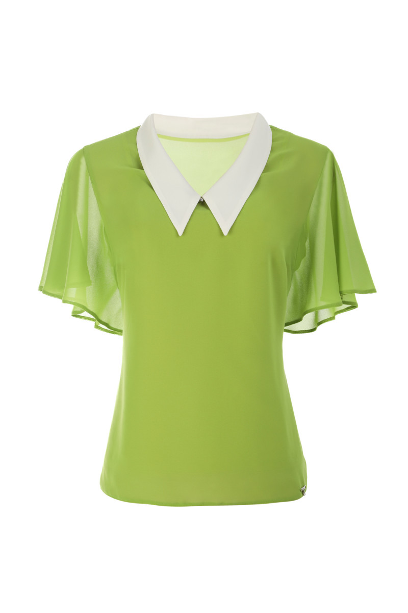 A solid color blouse with short, flowy sleeves is suitable for both casual and elegant out...
