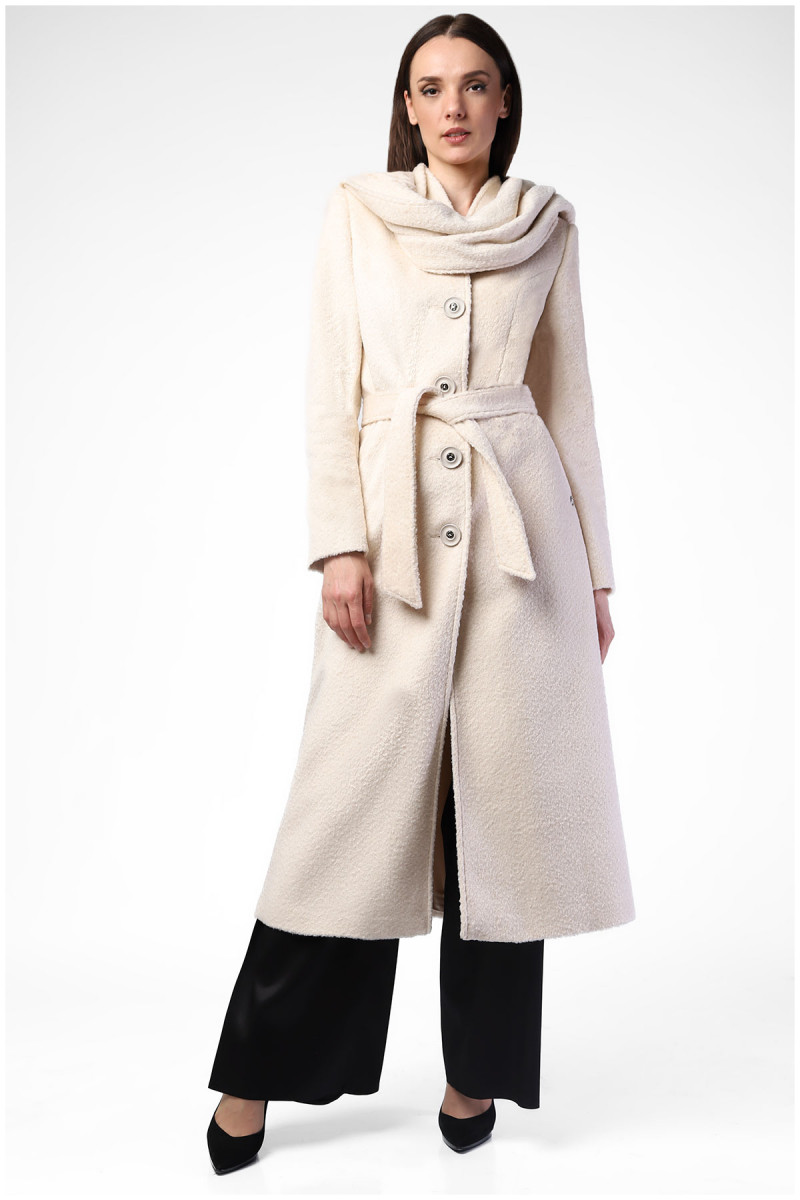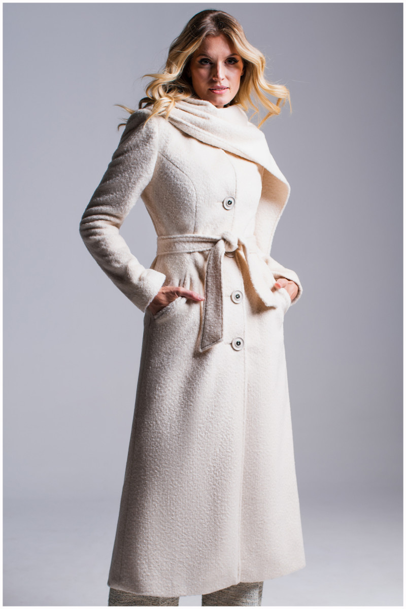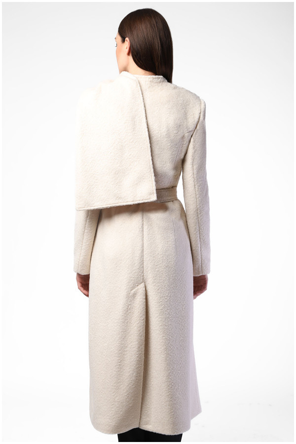 Sophisticated white coat with tie belt and sewn scarf that allows you to wear this model in different ways.