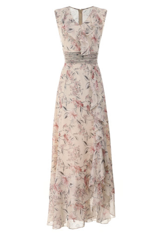 A long, sheer dress with flounces. The delicate beige shade and floral pattern add a touch of femininity to this model. The A-line cut is flattering for all body types. It is made of lightweight material with a high percentage of elastane, making it very comfortable to wear. Pair it with the appropriate shoes and handbag, and you'll have a perfect summer outfit.
