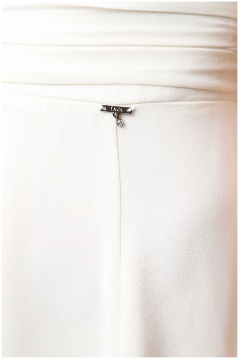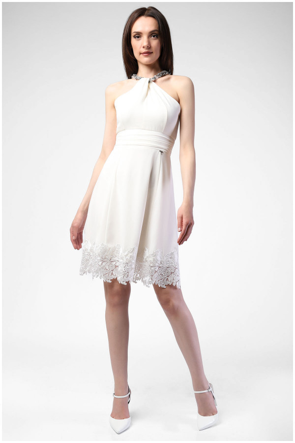 A short white dress with a necklace. The waist is accentuated with interesting detailing, while the hem of the dress is bordered with authentic lacework. Its viscose lining makes it very comfortable to wear during warmer days. Pair it with a bag and scarf from the same collection to create a perfect monochromatic outfit.