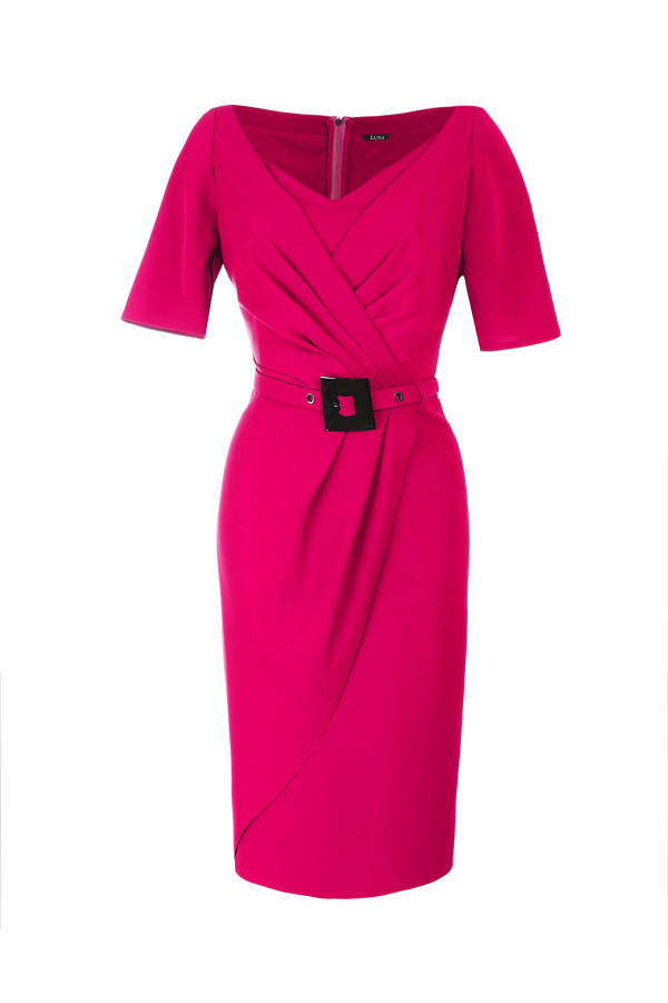 A tight dress with a straight cut follows the body line. It is refined with binder tapes in the area of the neckline, while the belt additionally emphasizes the waist. It is perfectly combined with shoes and jewelry from the Luna assortment.