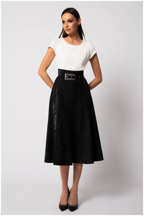 An elegant formal dress with short sleeves, perfect for various occasions. The belt allows you to highlight the waist, enhancing a more feminine and alluring look. Pair it with a blazer from the complementary collection to create a refined outfit that will make you stand out.
