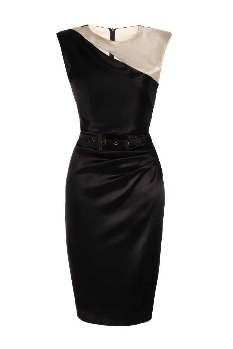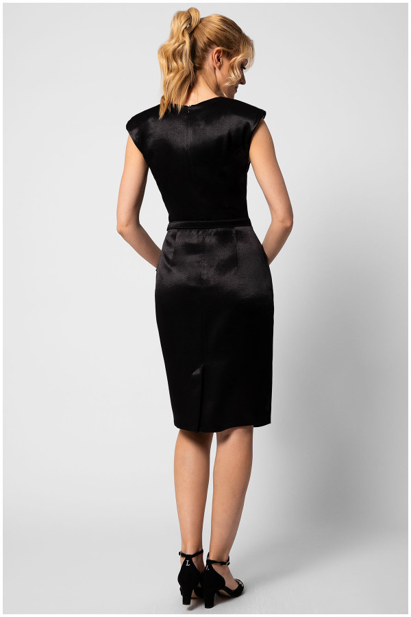 Elegant sleeveless formal dress. The fitted cut follows the body's natural lines, perfectly shaping the figure, while the belt accentuates the waist. An asymmetric detail at the neckline adds a touch of femininity and sophistication. Pair it with a matching handbag and Luna shoes to create a striking, feminine outfit.