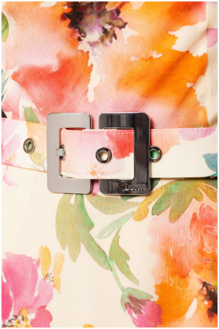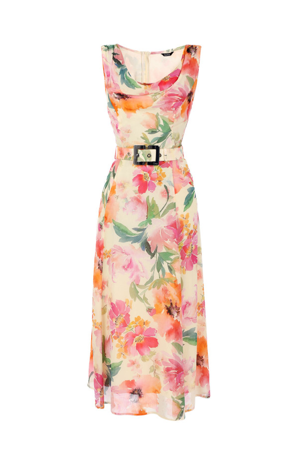 A feminine sleeveless midi dress with a floral pattern. The belt accentuates your waist. The viscose lining makes it very comfortable to wear. The cut fits all body types perfectly and effectively conceals imperfections. Paired with statement jewelry and Luna shoes, you will have the perfect outfit for any occasion.