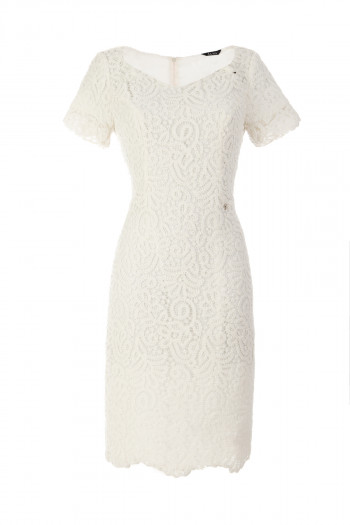 A long dress with short sleeves made from lace material, perfect for warm summer days.
