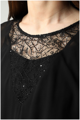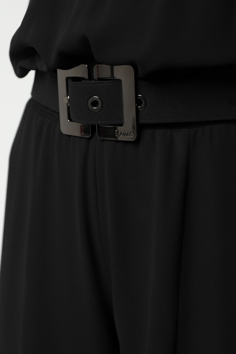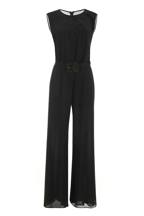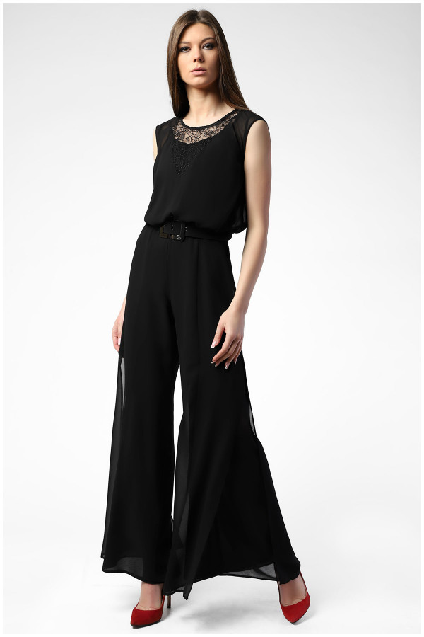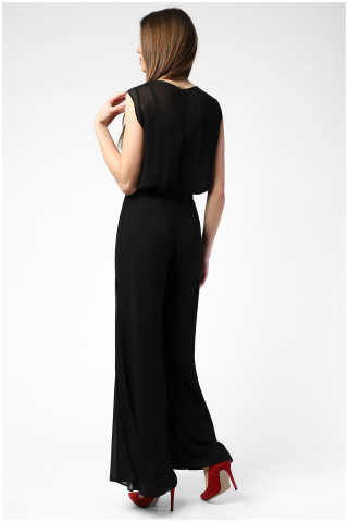 An elegant black sleeveless jumpsuit. The viscose lining makes this model very comfortable on the skin. The elastic waistband ensures a perfect fit to your body shape. The upper part of the jumpsuit is enhanced with a unique detail. For the most effective look, combine it with a scarf.